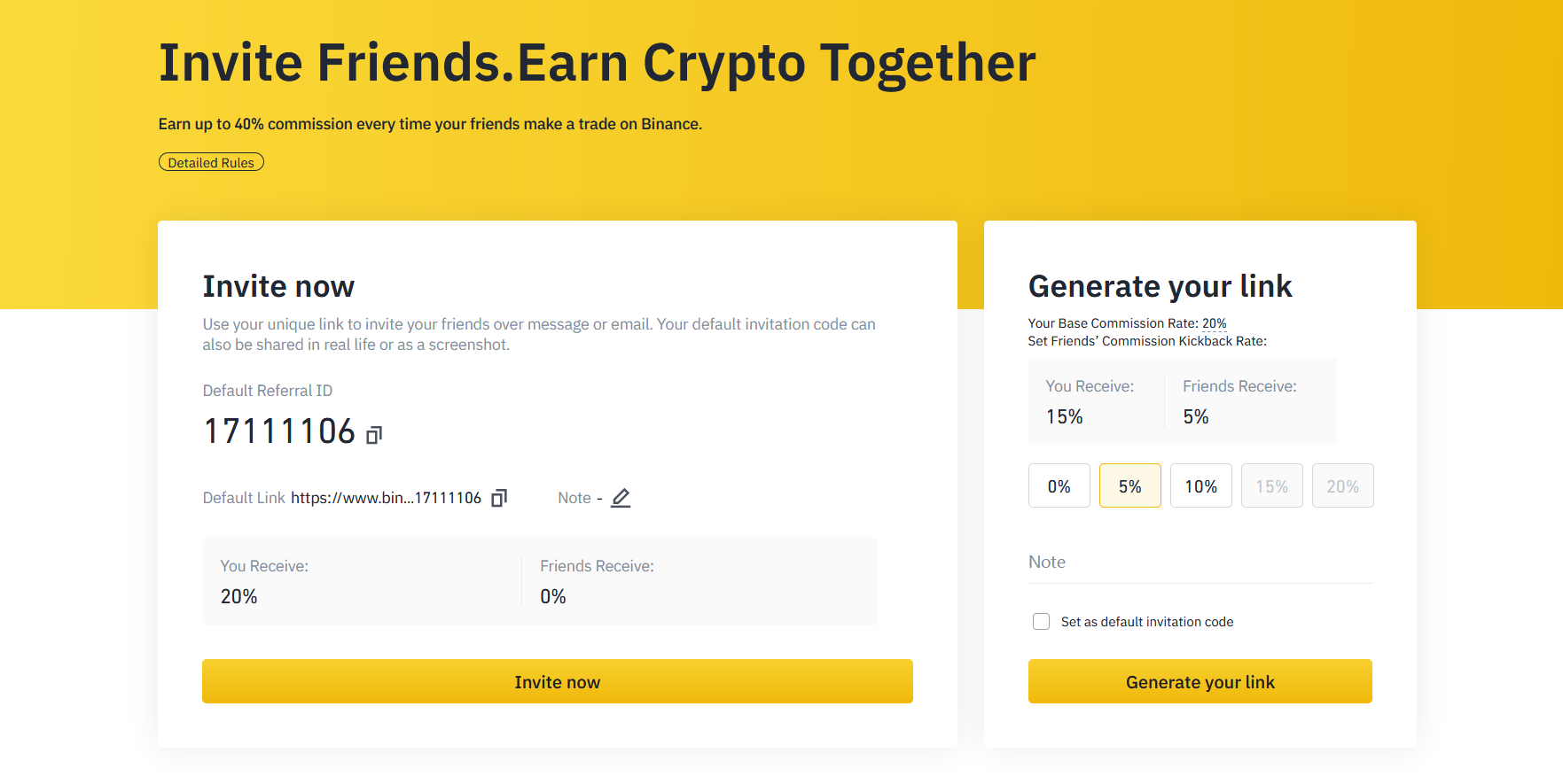 You can also adjust the percentage of the commission you’d like to receive so that your referees can have some kickback. The base referral rate is 20% if your daily average BNB account balance is less than 500 BNB. Otherwise, you can earn up to 40% in commissions.