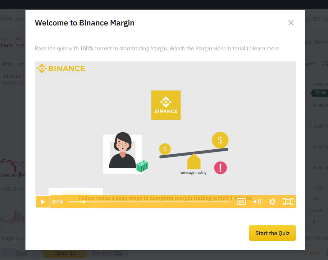 To get started on your margin trading journey on Binance, you will need to take a short quiz after seeing a video that explains how the process works. This is a good thing if you ask me. Here’s a quick rundown of the video: