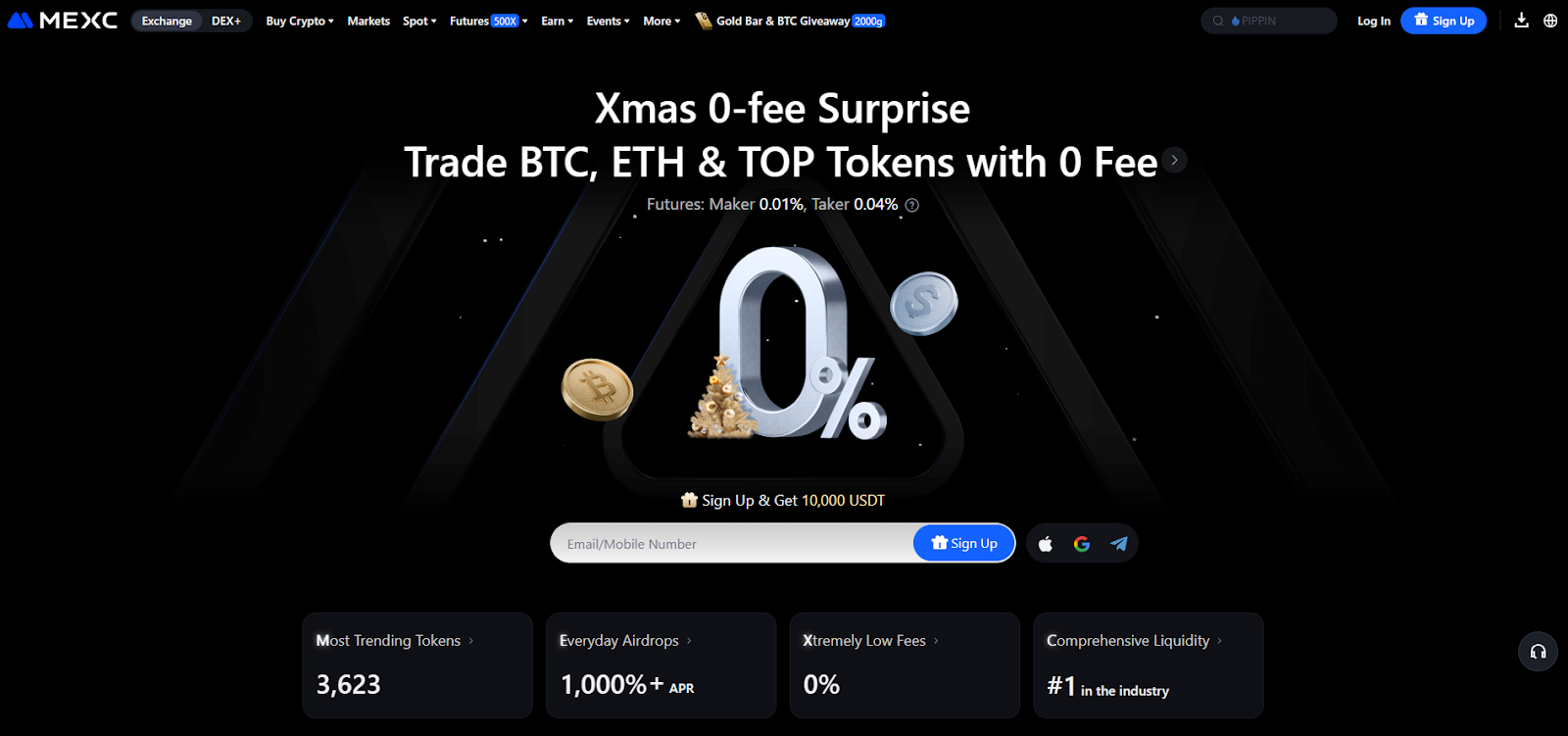 Alt text: MEXC crypto exchange with 3,000 cryptocurrencies featuring zero-fee spot trading and early memecoin listings