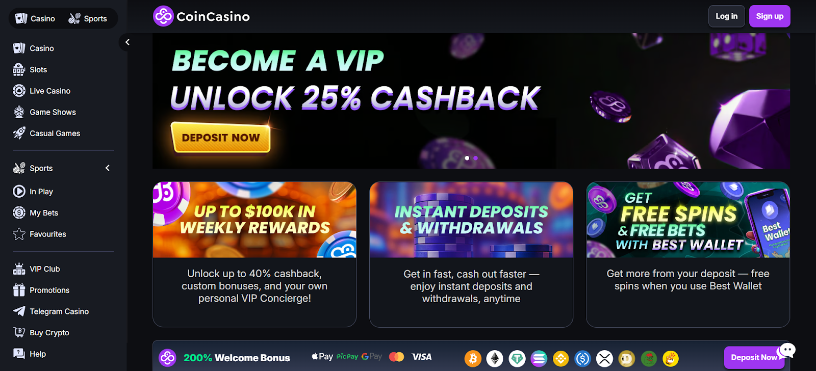 CoinCasino launched in 2024 with a privacy-first approach, offering instant registration via email or Telegram.