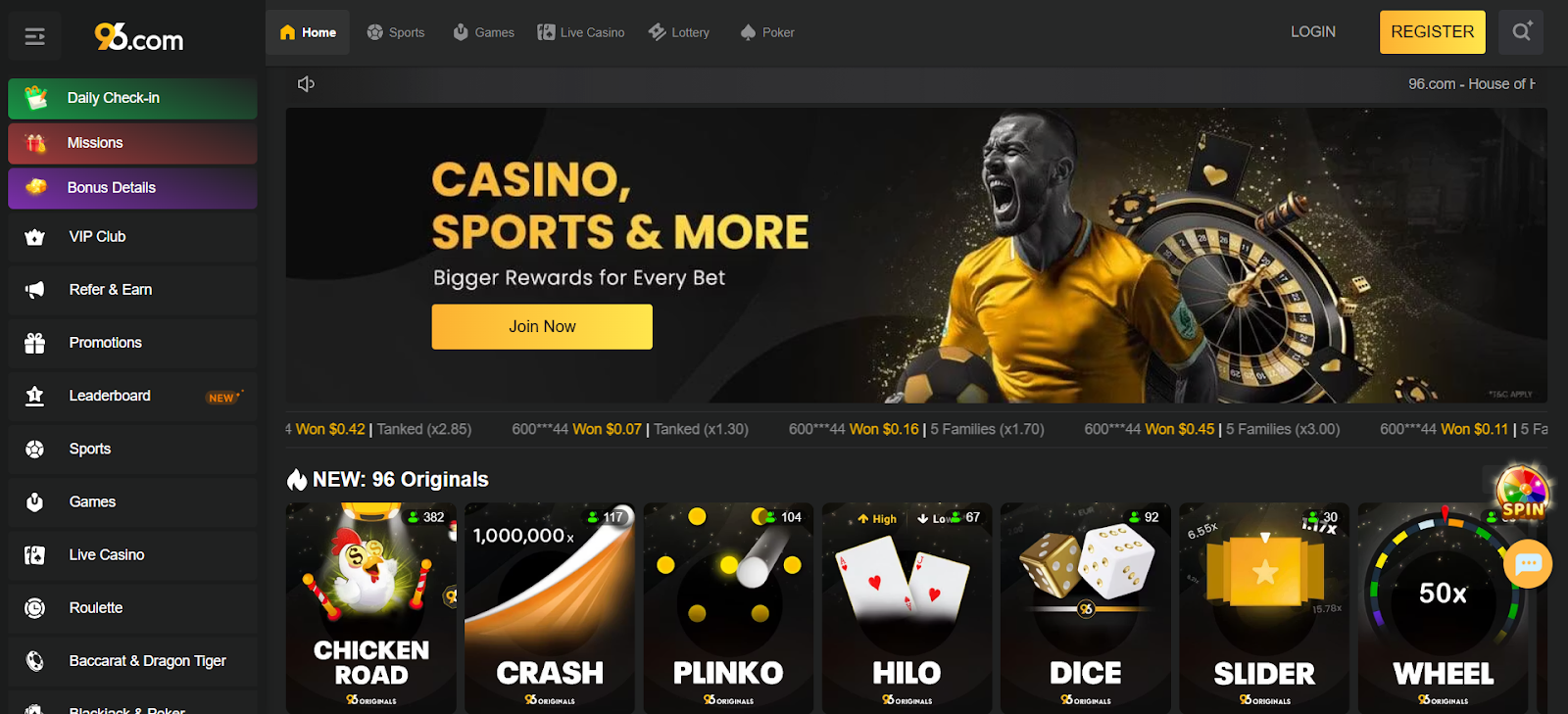 96.com specializes in stablecoin gambling with USDT as its primary currency and minimal verification requirements.
