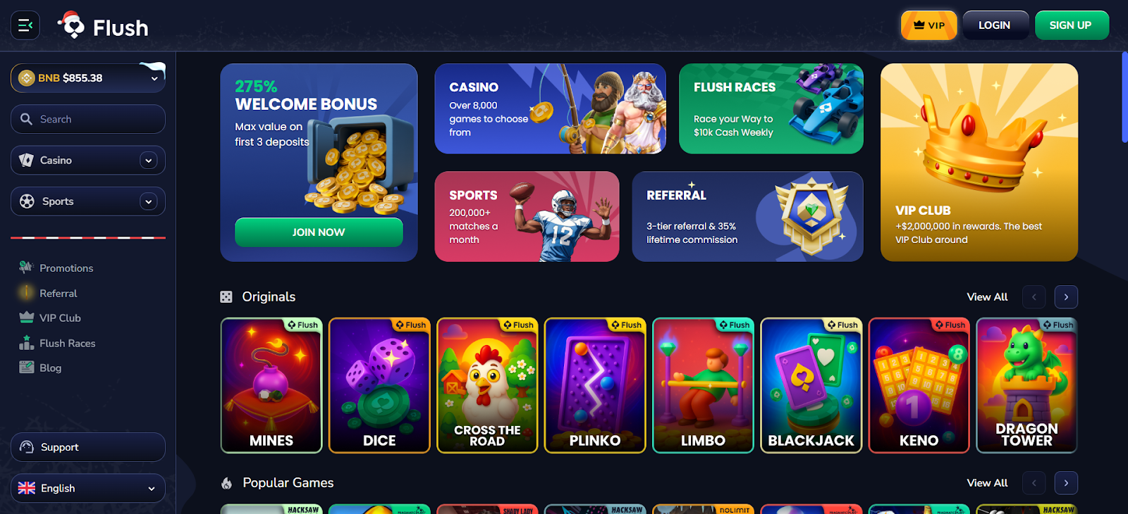 Alt text: Flush Casino homepage showing sleek interface and VIP program as a no KYC casino Canada.