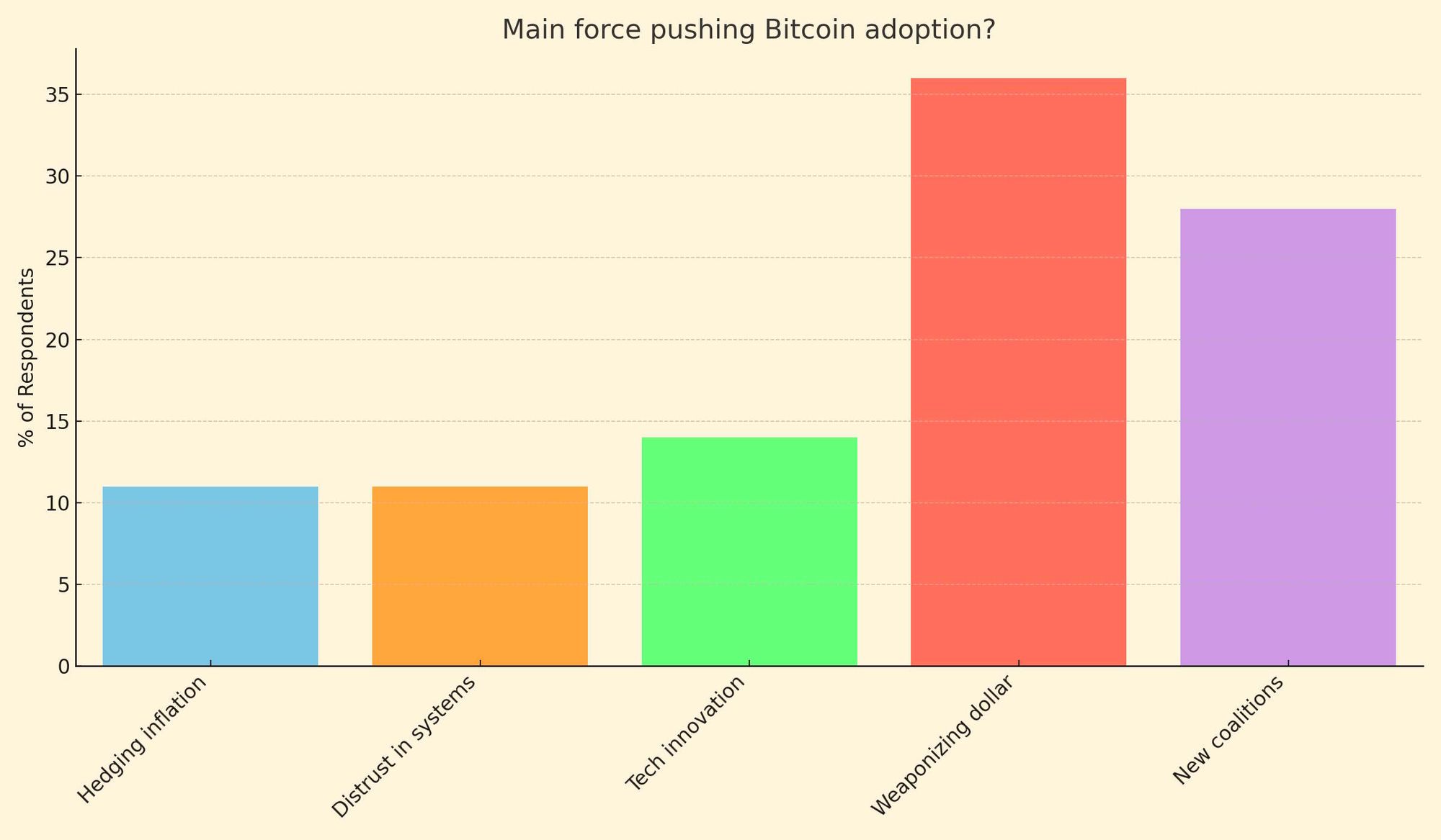 • 36% say weaponizing dollar drives Bitcoin adoption.