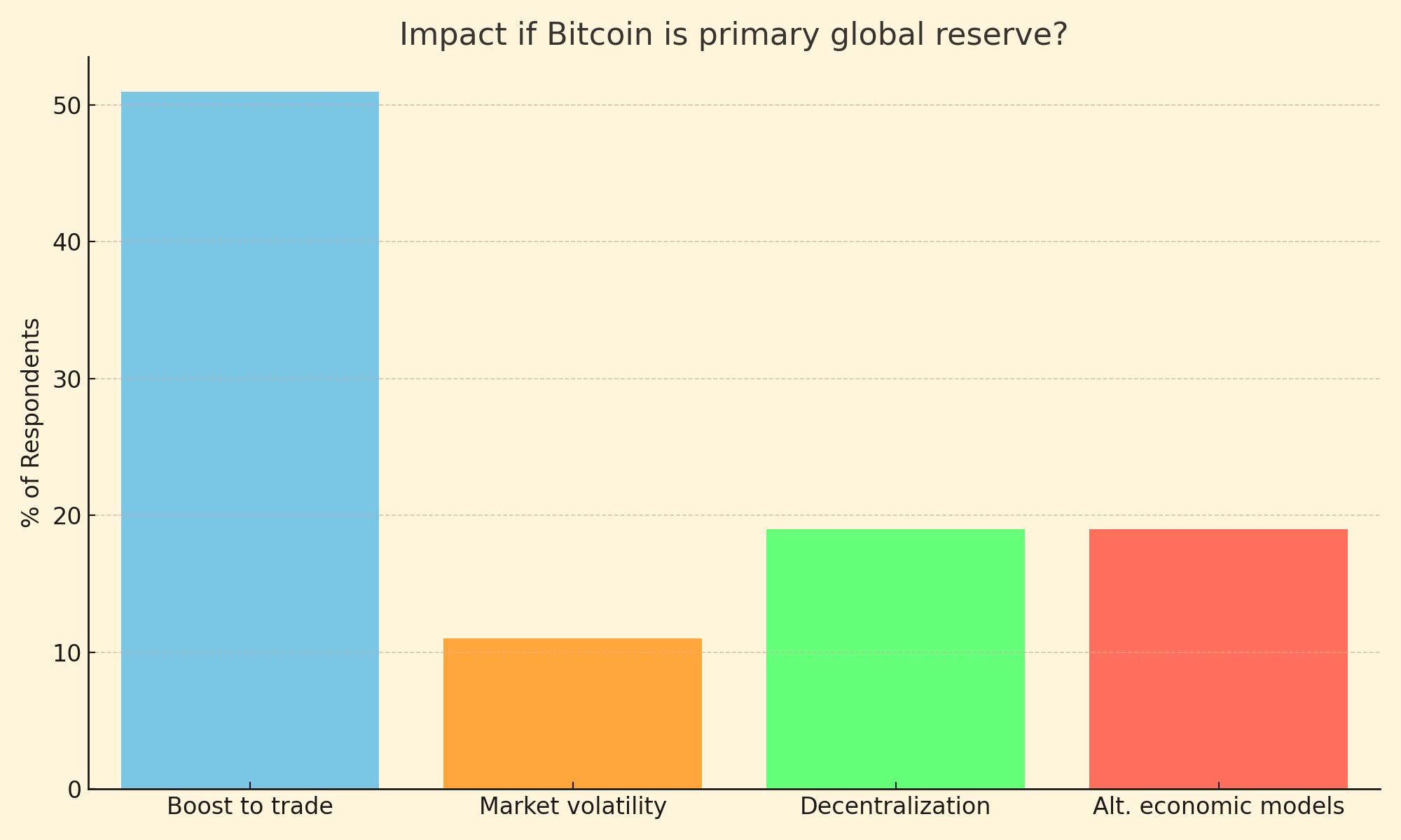 The most popular response, cited by 51% of respondents, was that Bitcoin would provide a major boost to global trade. By enabling faster, lower-cost cross-border payments, Bitcoin makes international trade more efficient. Its borderless nature removes friction and levels the playing field for global commerce.