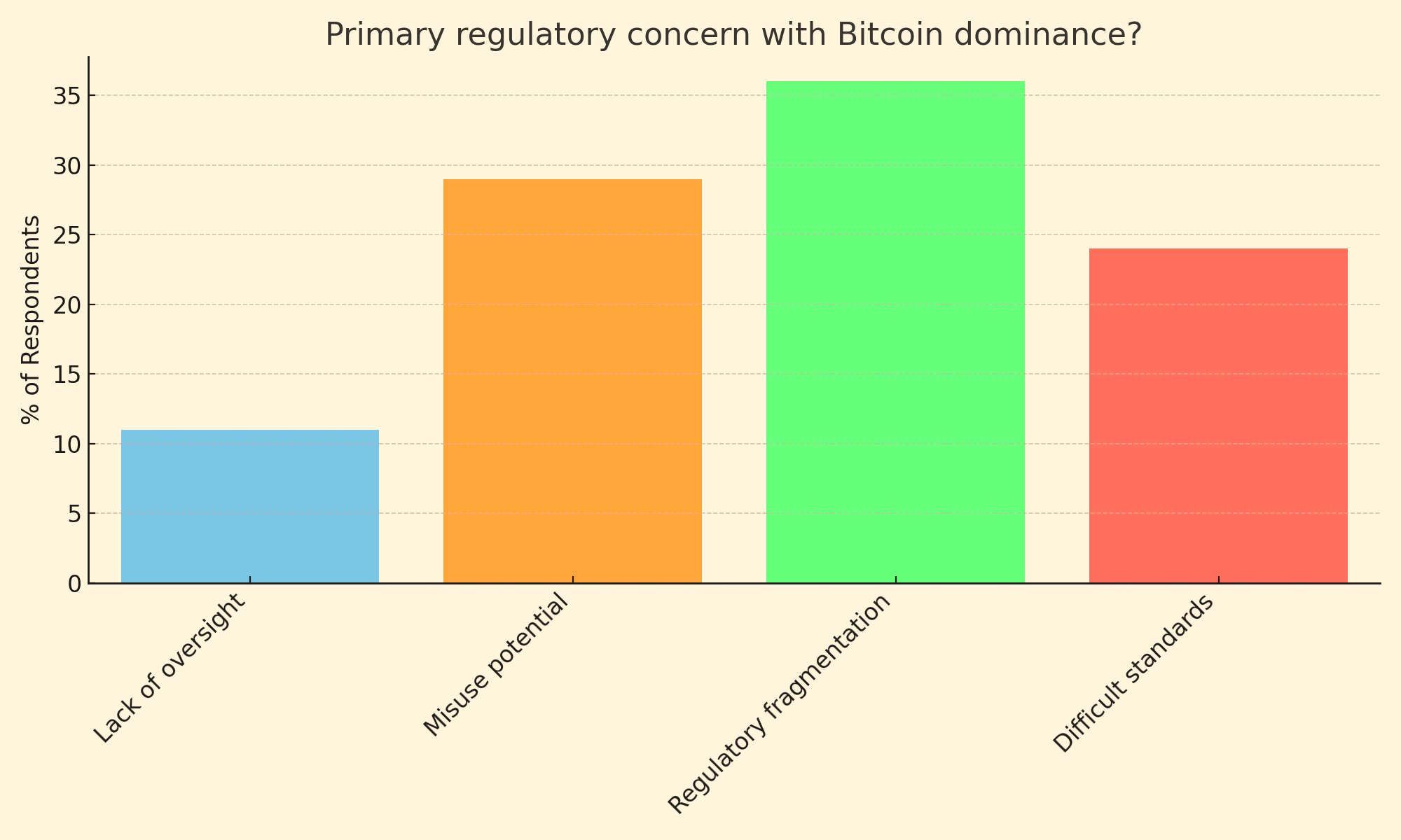 The most common response, from 36% of respondents, was regulatory fragmentation across different countries. If Bitcoin becomes dominant, lack of unified regulatory standards globally could hinder its stability and mainstream adoption.